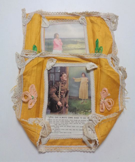 Early Twentieth Century School : A pair of chromlithographic wartime postcards : "Across the Sands of Time" and "You Can Always Come Back to Me", each 15 cm x 10 cm, each with matching enbroidered cloth surrounds. (2)