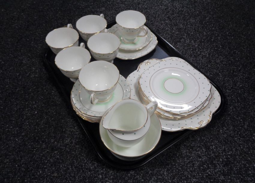 A tray of Windsor bone china, polka dot tea ware.