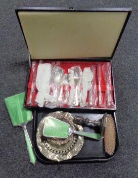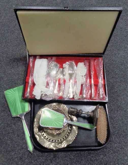 A part canteen Viner's cutlery, a three piece Art Deco dressing table brush set, together with plated wares.