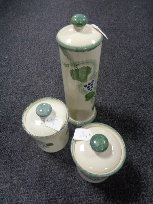 A Poole Pottery hand painted 'Grape' pattern lidded spaghetti jar, together with two matching lidded storage jars. (3)
