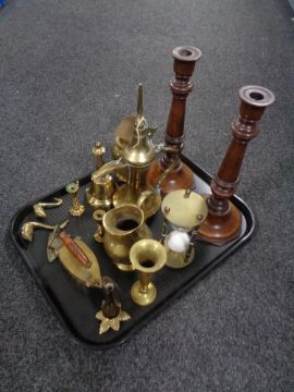 A tray of brass to include hand bell, miniature candlesticks, a pair of wooden candlesticks.
