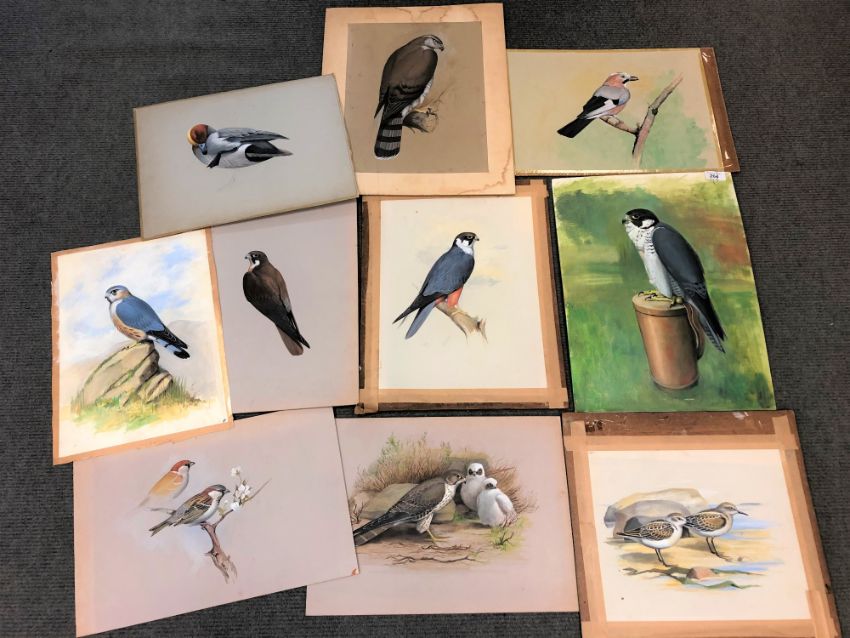 James Deacon : Portrait of a bird of prey perched on a leather flask, oil on board, 45 cm x 33 cm, together with nine watercolours by the same hand, all depicting various birds, all parts unframed. (10)