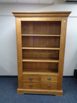 A set of contemporary oak open bookshelves fitted with four drawers.