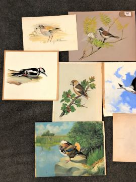 James Deacon : Portrait of a finch perched on a leafy branch, watercolour, signed, 27 cm x 36 cm, together with nine further watercolours by the same hand, all depicting various birds, all parts unframed. (10)