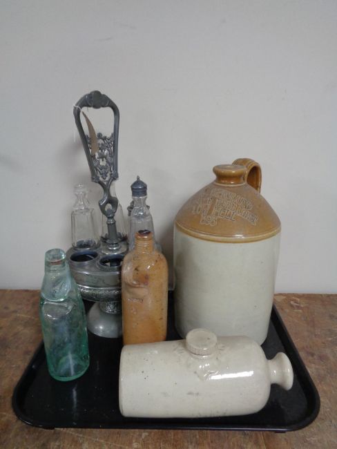 A Portobello ceramic flagon together with a part cruet stand, antique glass bottle etc.