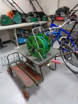 A metal wheelbarrow together with a folding sack barrow/trolley and a hose pipe on reel