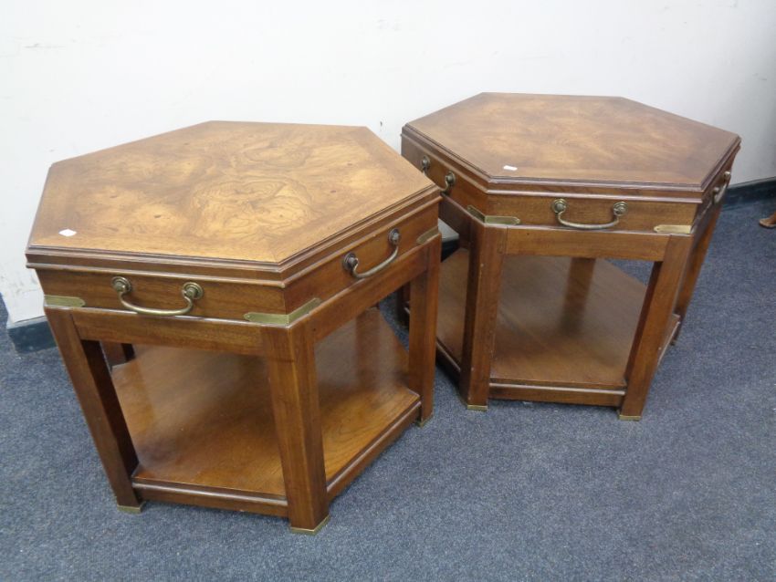A pair of hexagonal two tier tables with brass handles and mounts.