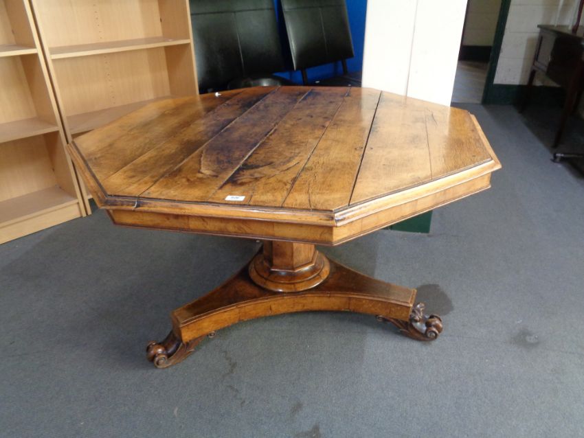 A 19th century octagonal oak tilt topped pedestal table.