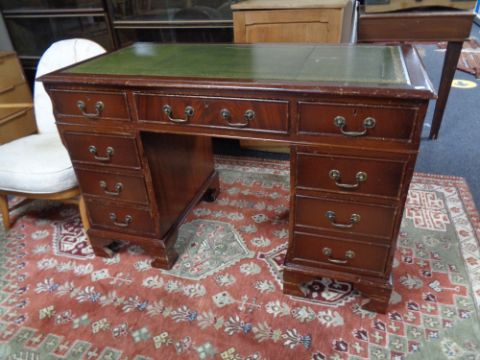 A mahogany twin pedestal desk fitted nine drawers with green tooled leather inset panel