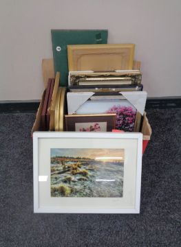 A box containing assorted framed pictures and prints, oil on canvas, still life, signed photographs etc.