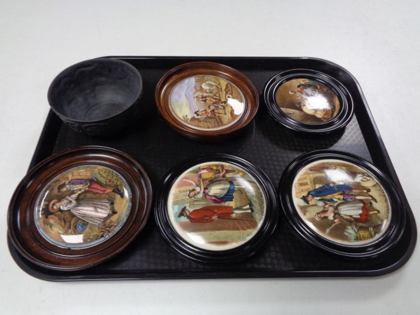 Five antique and later pot lids in frames, Cries of London etc, together with a Wedgwood Black Basalt sugar bowl