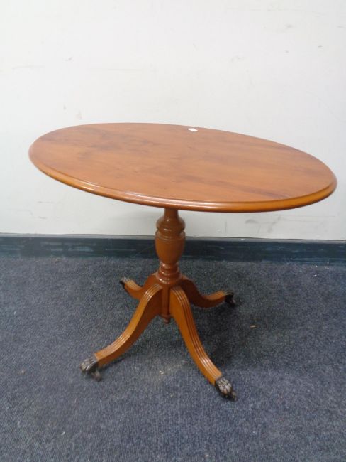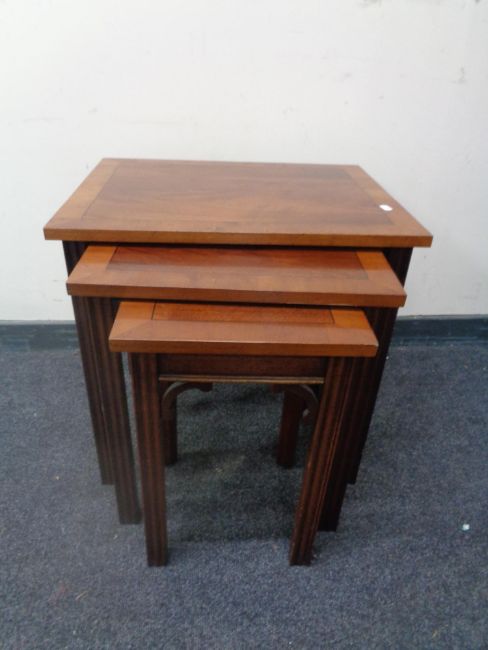 A nest of three inlaid yew wood tables together with an oval yew wood pedestal wine table.