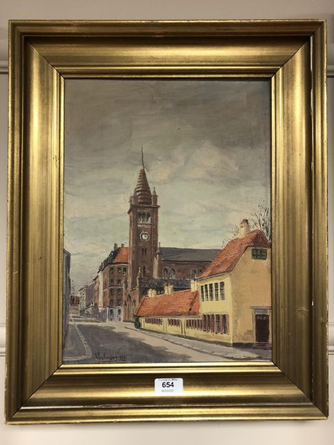 Continental School : Street scene with church, oil on canvas, signed Wilman, dated 1932, 39 cm x 29 cm, framed.