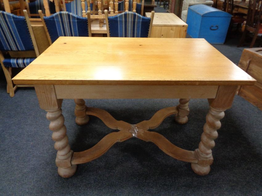 An early 20th century oak dining table on barley twist legs with under stretcher.