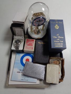 A tray of Bradford Exchange RAF spitfire wrist watch, Bradford Edition RAF Wings of Valour anniversary clock together with other RAF memorabilia, cigarette cards and case etc