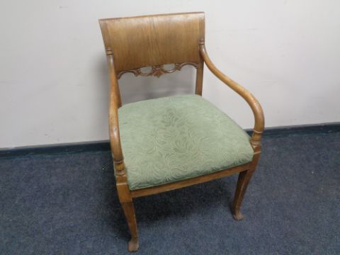 A 20th century scroll armchair upholstered in a green brocade fabric.