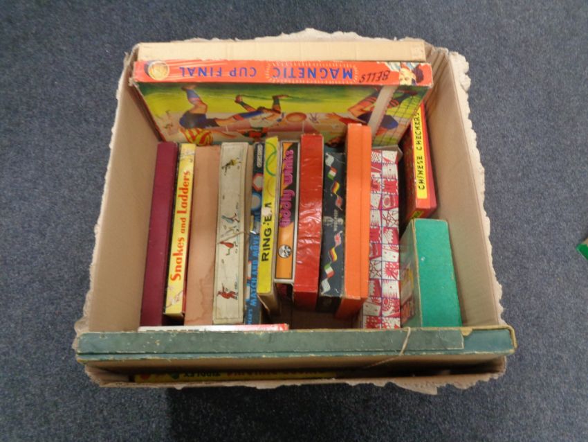 A box containing vintage board games to include Magnetic Cup Final, Pixie Derby, etc.