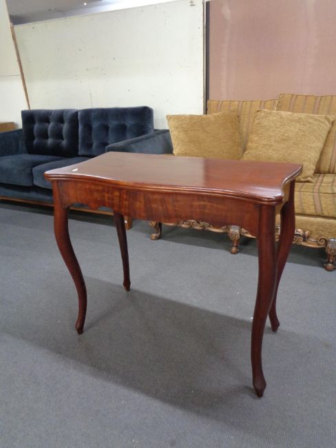 A late 19th century mahogany serpentine fronted turnover top table on cabriole legs.