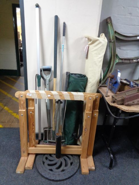 A pair of pine trestle stands together with a garden parasol with stand, folding chair in bag and small quantity of garden tools