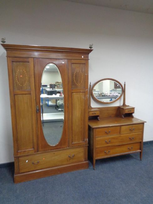 A late Victorian inlaid mahogany mirror door wardrobe, fitted drawer beneath, together with four drawer dressing chest.