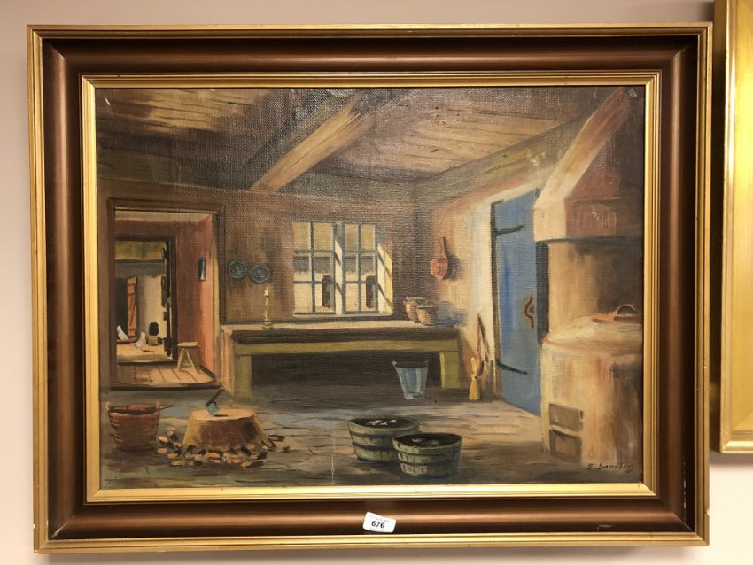 Continental school : Cottage interior, oil on canvas, 66 cm x 48 cm, indistinctly signed, framed.