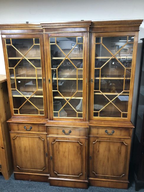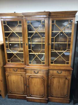 A yew wood triple door break front bookcase with astral glaze doors, fitted cupboards and drawers beneath.