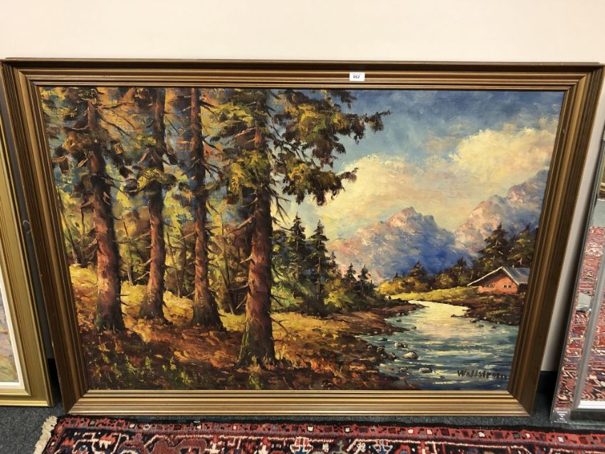 Continental School : Alpine landscape, oil on canvas, 136 cm x 96 cm, indistinctly signed Wallstrom, framed.