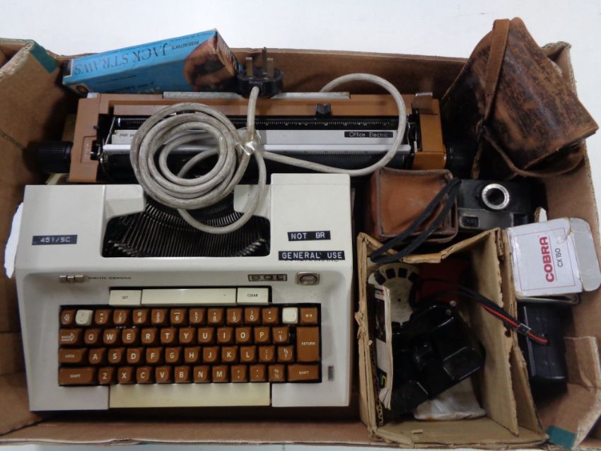 A box containing Smith Corona typewriter, assorted cameras, View master with reels.