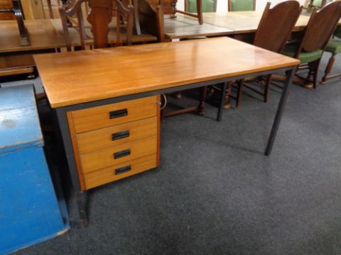 A mid 20th century teak single pedestal desk on metal legs.