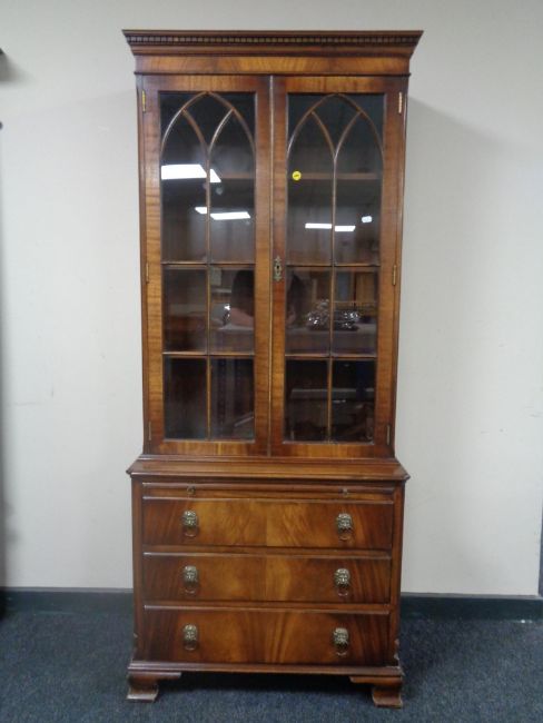 A Regency style mahogany double door bookcase with glazed doors, fitted three drawers and slide below with lion mask handles.
