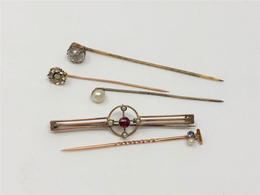 Gold brooches and pins including a 15ct gold pearl and sapphire example (5)