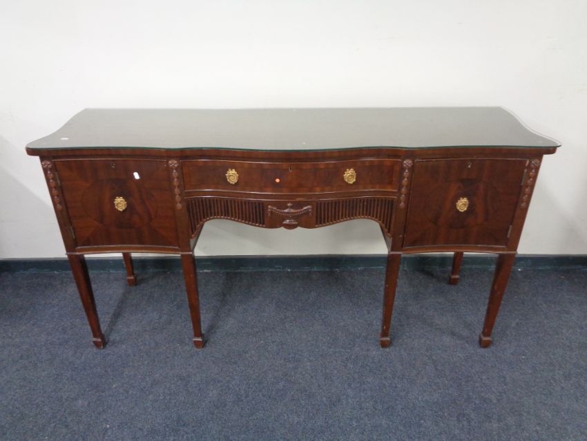 A Regency style mahogany serpentine fronted sideboard on raised legs with glass top.