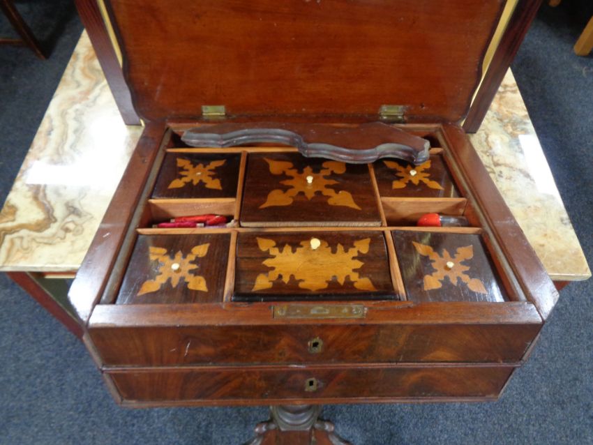 A 19th century mahogany work table on pedestal (as found).