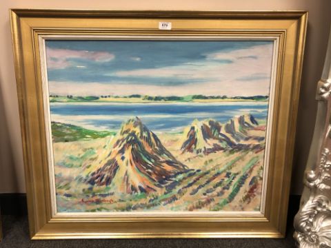 Continental School : Hay stacks, oil on canvas, 72 cm x 59 cm, indistinctly signed, framed.