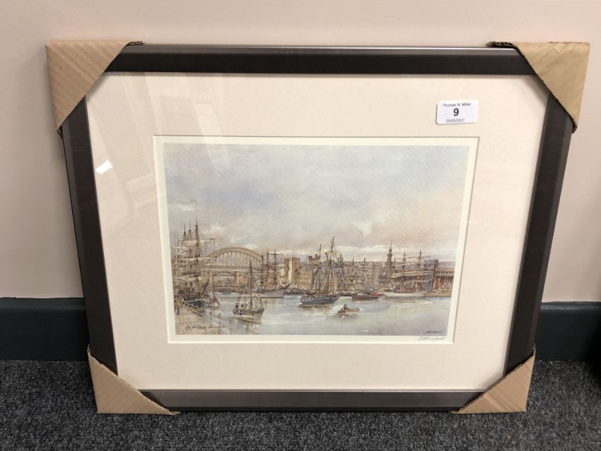 After Tom MacDonald : The Tall Ships, Newcastle, reproduction in colours, signed in pencil, 21 cm by 30 cm, framed.