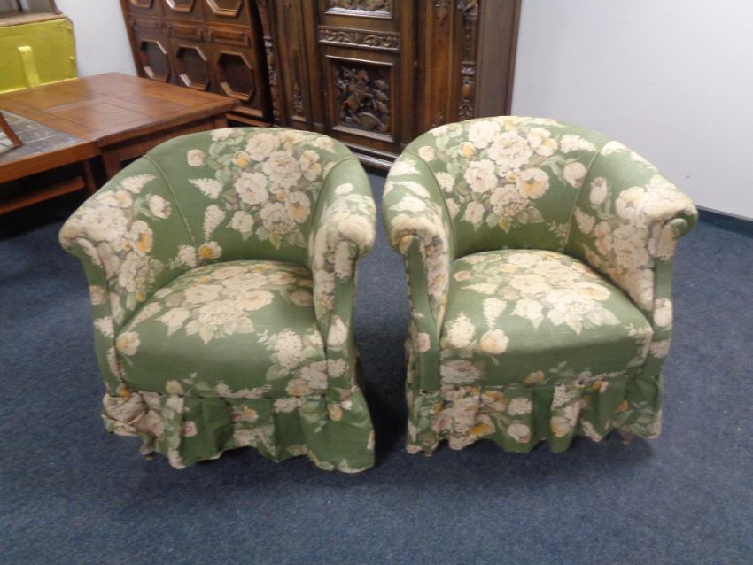A pair of early 20th century tub chairs upholstered in a green floral fabric on Queen Anne legs.