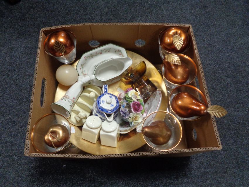 A box containing contemporary wine glasses, glass fruit bow with artificial fruit, Lurpak butter rack, china flower posy etc.