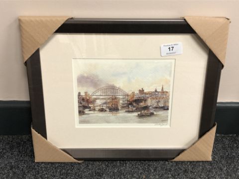 After Tom MacDonald : The Tyne at Newcastle upon Tyne, reproduction in colours, signed in pencil, 13 cm by 18 cm, framed.