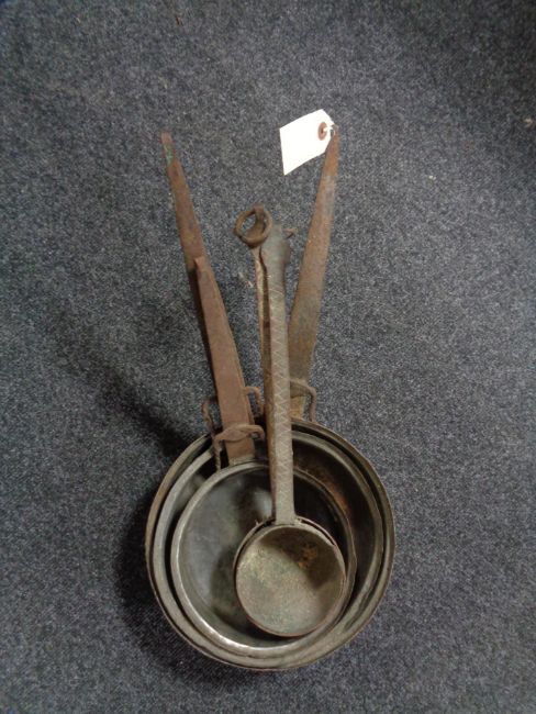 Five antique copper cast iron handled pans
