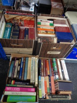 Four boxes containing assorted books to include Penguin paperback novels, Tolkien, reference etc.