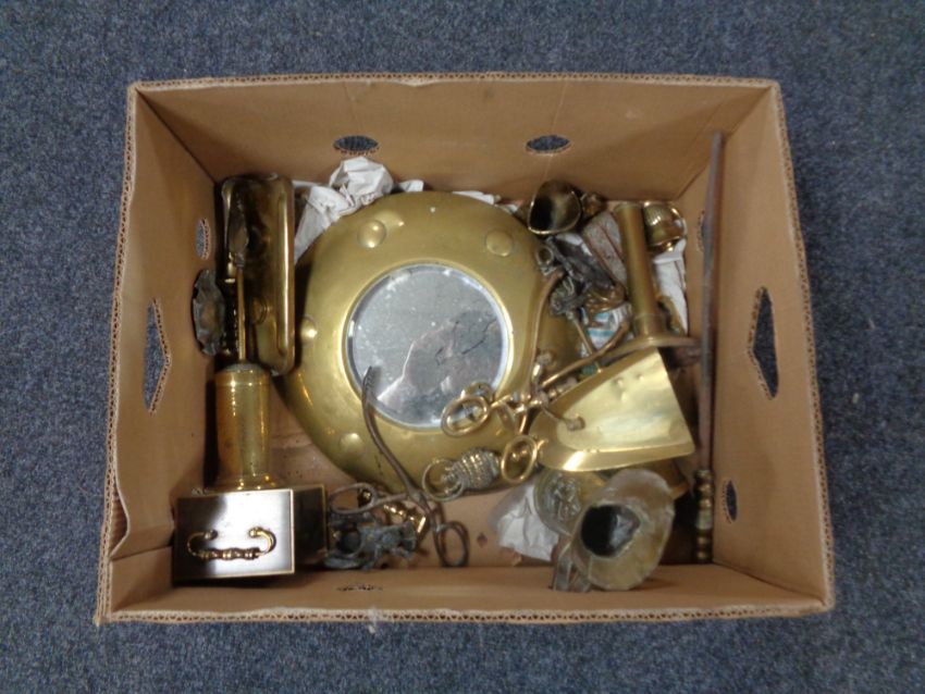 A box of assorted brass ware, companion pieces, porthole mirror, carriage clock etc
