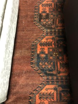 Pile worn thin but evenly so. Some small areas of moth damage to the center. Some fraying to the selvedges.