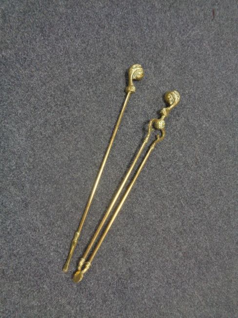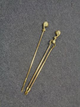 A late nineteenth century brass fire tongs and poker with claw and ball handles