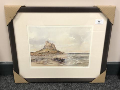 After Tom MacDonald : Lindisfarne Castle, reproduction in colours, signed in pencil, 21 cm by 30 cm, framed.