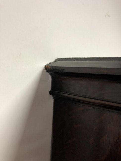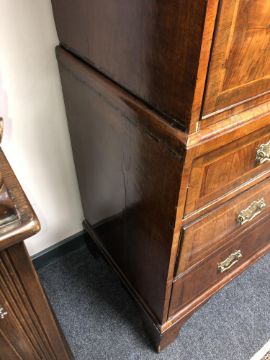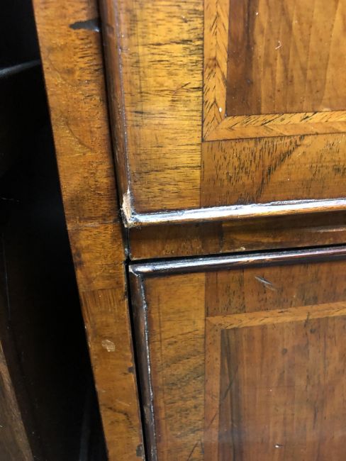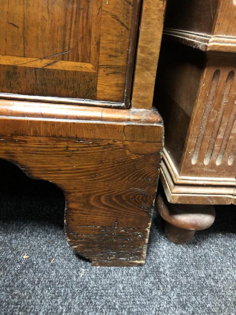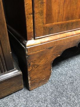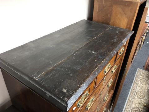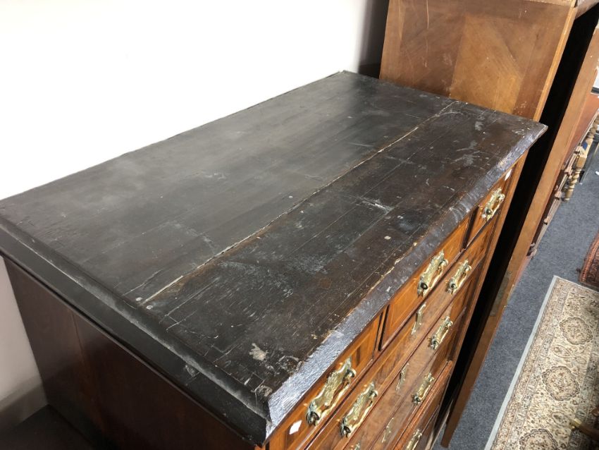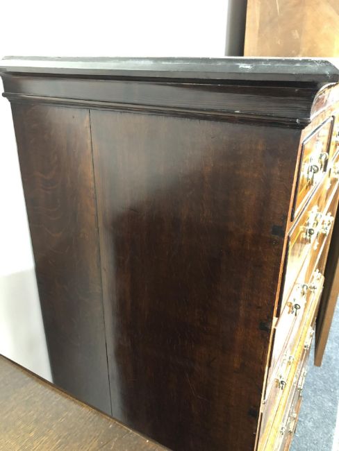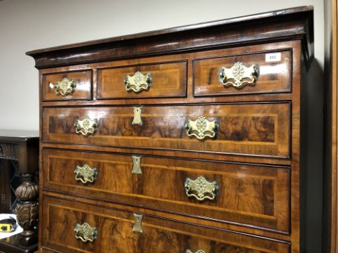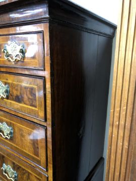 The veneer is a good rich colour and is mostly intact. There are a few small losses to be expected, as well as some old replacements. There are some small losses to the moulding around some of the drawer fronts, see images. The brass handles and fittings are later. The drawers do not exactly run smoothly but pull out easily enough. There are natural splits to the drawer linings, as well as to the sides of the chest. I cannot see any signs of worm. This measures 105cm wide by 55cm deep by 174cm high.
