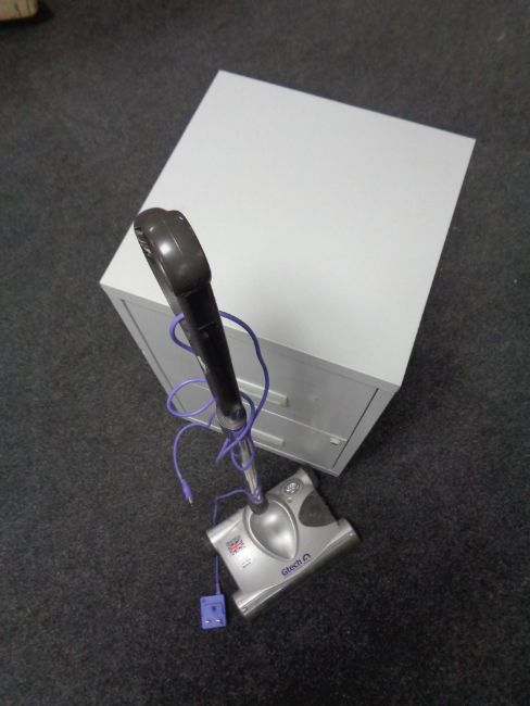 A metal two drawer filing cabinet together with a G-Tech electric carpet sweeper.