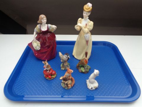 A tray of two bone china lady figures, five small Border Fine Arts figures including squirrel, mouse etc