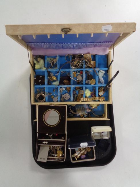 A tray of jewellery boxes, costume jewellery, enamelled badges, lady's watches etc