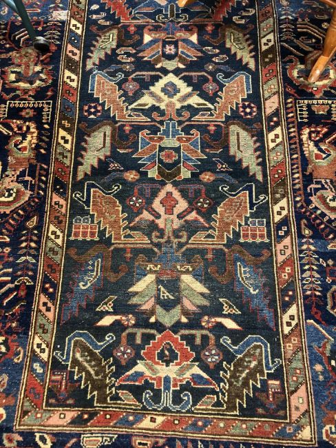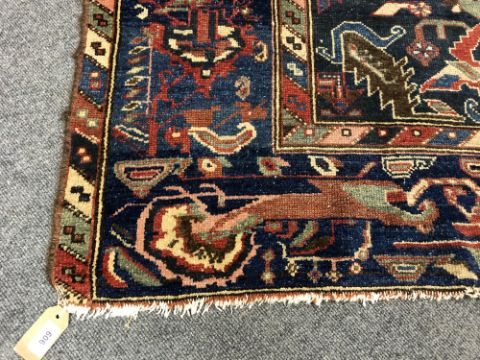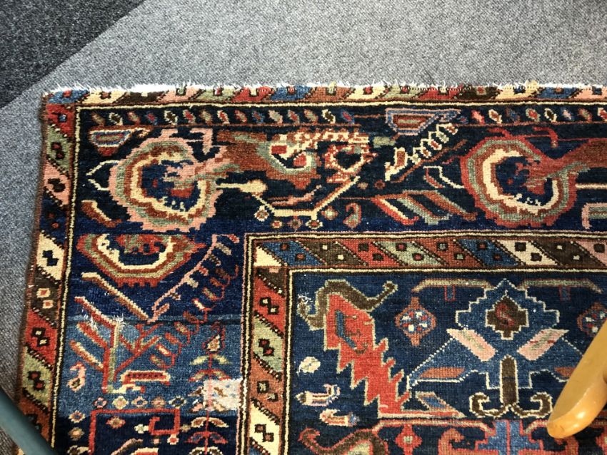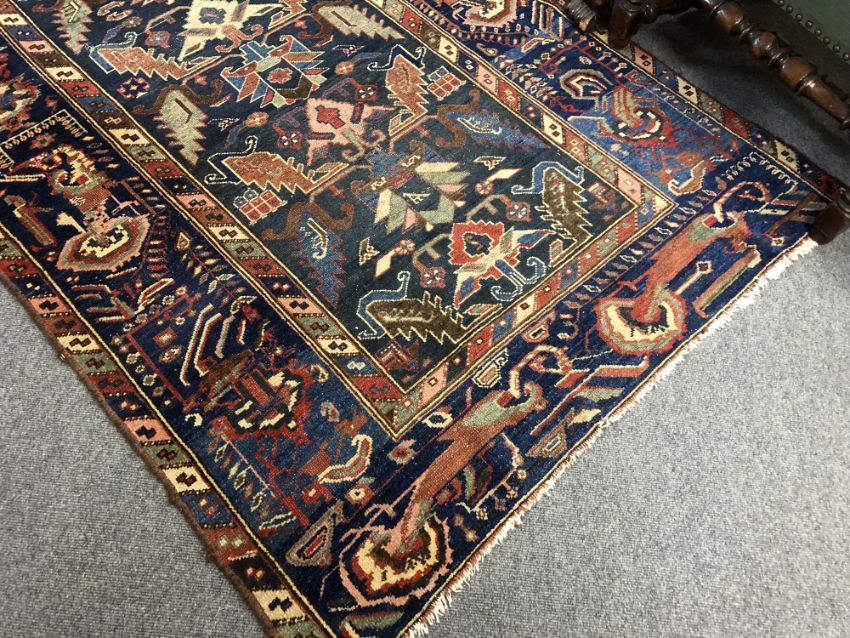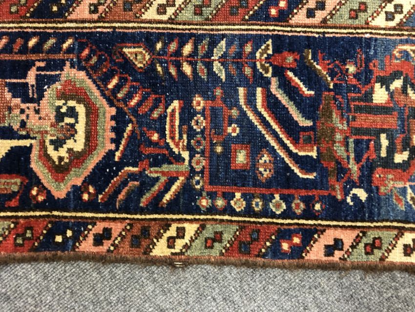 Pile worn but quite evenly so. Fringes reduced at both ends. Some fraying to selvedges. Generally good condition. May benefit from a professional clean.