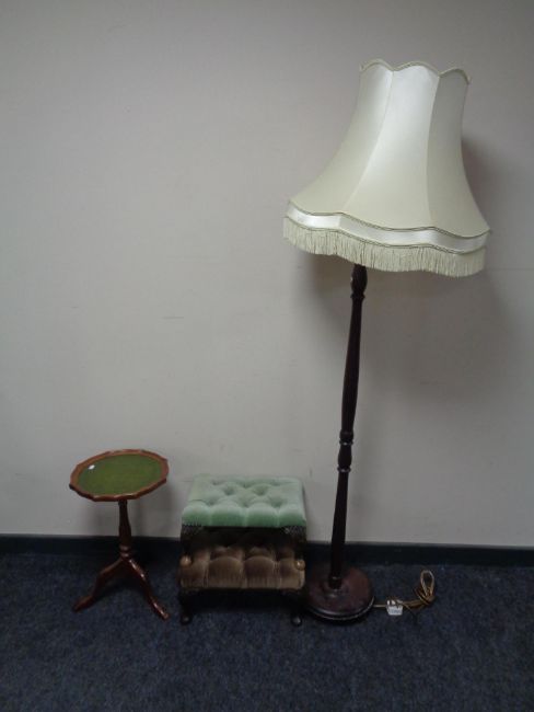Two button dralon upholstered foot stools together with a leather top wine table and a standard lamp with tasseled shade.